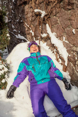 Rest in the snow. Beautiful satisfied girl in overalls lies with her back in the snow and smiles
