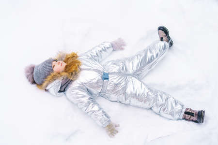 Girl plays in snow. Child lies in snow spreads his arms to side in the form of an angel. Happy little girl in warm silver jumpsuit