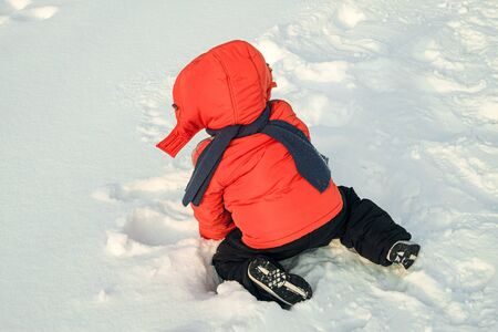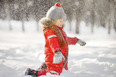 Little playful boy in red winter clothes having fun with snow. Active outdoors leisure with children in winter. Kid with warm hat, hand gloves and scarf is playing in snow banks