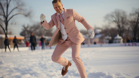 Boldly braving the frosty field, a dapper gentleman leaps into the wintry sky, clad in sleek attire and sturdy skates, exuding a sense of fearless adventure and determination