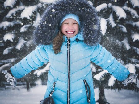 Portrait of a beautiful little cheerful girl. A child in the winter outdoors