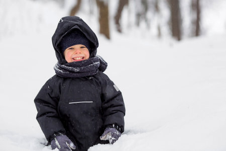 Year-old laughing baby boy in warm snowsuit walking in the winter park with a white snow. First winter and first toddler steps on the snow