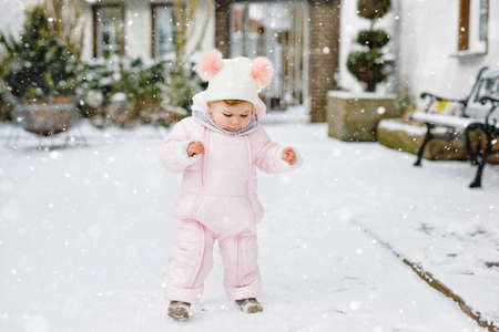 Happy little baby girl making first steps outdoors in winter through snow. Cute toddler learning walking. Child having fun on cold snowy day. Wearing warm baby pink clothes snowsuit and bobbles hat.