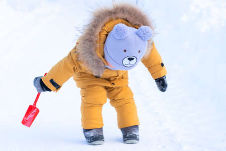 Portrait of a toddler 15-20 months old in yellow warm clothes holding a toy shovel in his hand and bending down to clean the snow on the path