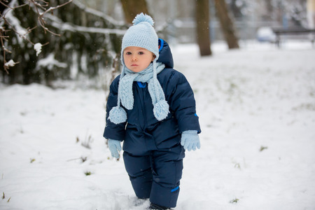 Cute little toddler boy, playing outdoors with snow on a winter day, snowing