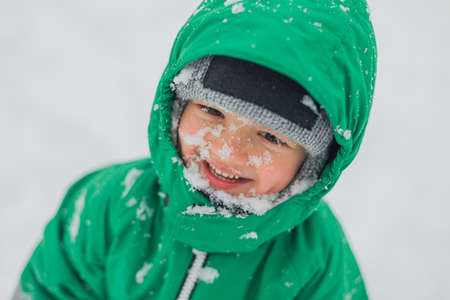 portrait of a happy child playing in the snow. There is snow on my face. The boy plays snowballs, a snow-stained face, winter dynamic games.