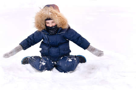 Little boy in winter clothes lies in a snowdrift and laughs.
