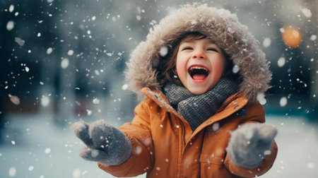 The child is warmly dressed, with a fur hood and a balaclava gaiter, protecting from the frost. Sits with open arms in mittens and looks with surprise and joy at the large of snow that has fallen.