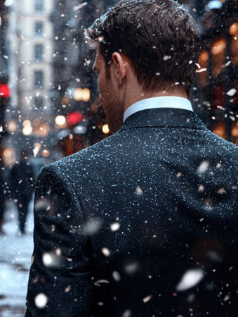 A man in winter coat stands outdoors as snow falls in vibrant urban setting during night