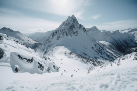 snowy mountain range, with skiers and snowboarders traversing the slopes, created with generative ai