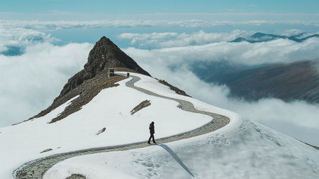 Rear view of a solitary person on a snow covered mountain summit, gazing at a breathtaking panorama of peaks rising above a sea of clouds on a clear winter day.