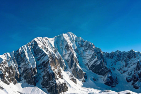 Majestic Snow Covered Mountain Peak Against Clear Blue Sky Capturing Tranquil Winter Landscape Beauty and Serene Wilderness.
