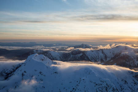 Beautiful Aerial Landscape View of the Mountain Range covered in Clouds during Sunset. Picture taken North of Vancouver, British Columbia, Canada.