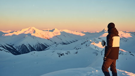 A man is standing on a snow-covered mountain peak, looking out at the beautiful sunrise. The sky is filled with clouds, and the sun is just beginning to rise, casting a warm glow over the landscape