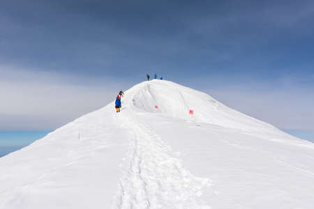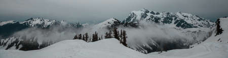 Panoramic view of the snowy mountains in the clouds. Switzerland