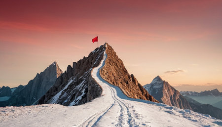 A hiker stands on top of a snow-covered peak, holding a flag. The sun shines brightly, illuminating the surrounding mountain range. The scene captures the thrill of reaching a summit.