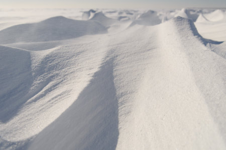 Sleet at a wind sticks to the ground, forming beautiful reliefs