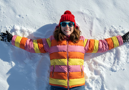 A happy woman lies in the snow, making a snow angel, wearing a colorful, puffy winter jacket with vibrant stripes of various colors. Generative Ai