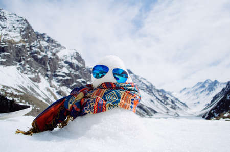A stylish snowman with a tribal scarf and blue reflective sunglasses with an epic blurry mountain background partially covered in snow and a small lake.