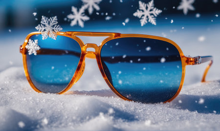 Sunglasses rest on a bed of snow, with snowflakes falling around them