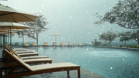 This serene image captures a poolside scene at a resort during a gentle rain, featuring lounge chairs and umbrellas. Ideal for conveying relaxation and tranquility.