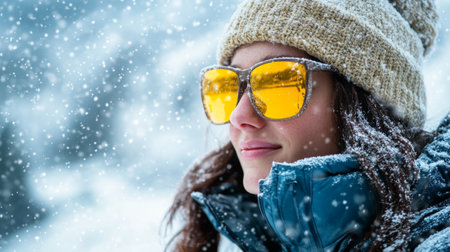 Portrait of a woman in sunglasses against the background of snowy mountains. Winter holidays and vacations concept