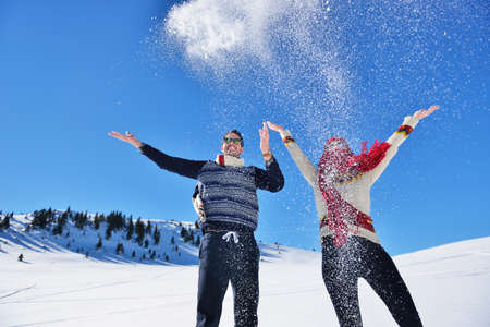 Young couple in love having fun on a snowy winter day. Smiling and laughing.