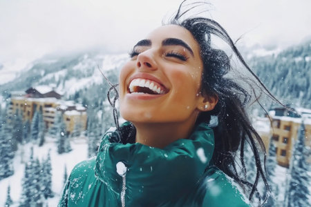 Joyful woman embracing winter wonderland with snowy mountains in background.