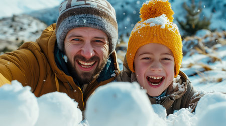 A joyful father and son share a playful snowball fight in a snowy winter wonderland Their laughter and smiles radiate warmth amidst the icy scenery, creating a heartwarming image perfect for holiday cards, winter activity promotions, and cherished family memories AI Generative