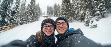 A cheerful couple enjoys a snowy day at a ski resort, smiling wide while taking a fun selfie. The surrounding winter forest adds to the picturesque landscape.