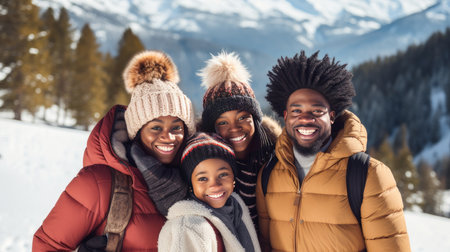 Happy, smiling, afro american family snow covered mountains at ski resort, during vacation and winter break. Concept of traveling around the world, recreation, winter sports, vacations, tourism in the mountains and unusual places.