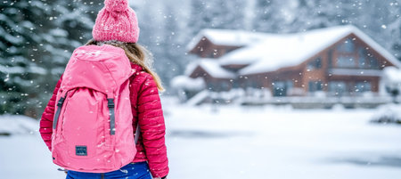 Charming girl admiring a picturesque snowy lodge nestled in a serene woodland landscape