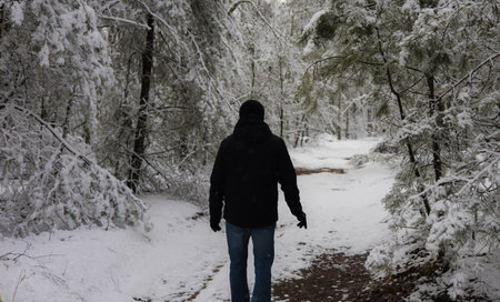 A tourist in a black jacket and blue jeans walks away from the camera along a snowy path surrounded by tall trees in a quiet, snow-covered winter forest. Winter walk through a snowy forest.