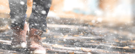 Walk on wet melted ice pavement. First person view on the feet of a man walking along the icy pavement. Pair of shoe on icy road in winter. Abstract empty blank winter weather background