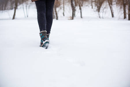 Woman's legs in winter boots walking in the snow. Background with selective focus and copy space for text