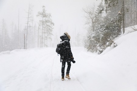 Climber (hiker) is going for the top of a mountain in an extreme blizzard. Snow storm in forest with snow covered terrain. Adventurer (photographer) walking through the forest in heavy conditions.