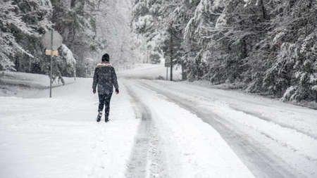 Man in winter on street. Townsman on road. Road is in snow and man.