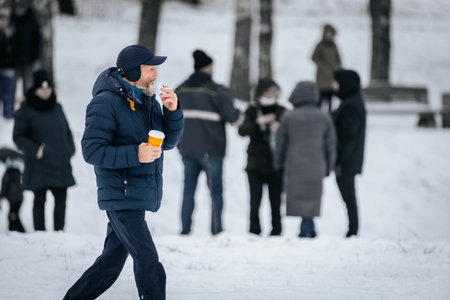 Valmiera, Latvia - January 02, 2026: Senior man dressed warmly walks in snowy park holding coffee cup while others gather in the background enjoying the winter day