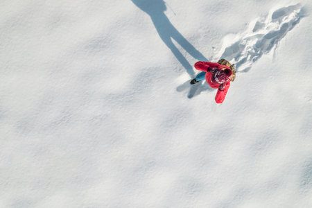 Woman in a red christmas jacket with backpack walking on the snow and doing footprints in a park. Winter. Drone, top, aerial view.