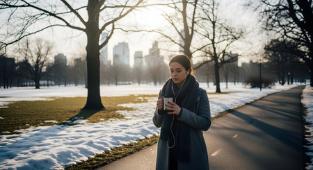 A young woman bundled in a warm winter coat and scarf, holding a hot beverage in a cup, walks along a path in a snow-covered park. Bare trees line the path, and a distant city skyline is visible under a bright sky, suggesting a crisp winter day.