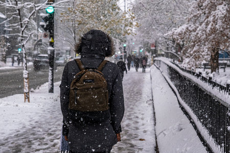 Montreal, CA - 16 November 2022: First snowfall of the season hits the city. People walking in Montreal Downtown