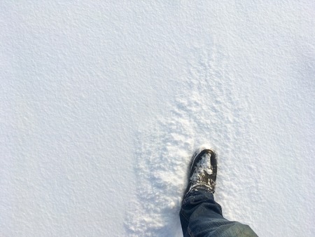 Walking on snow covered ground. Hiking boots covered in snow. Winter outdoor activity