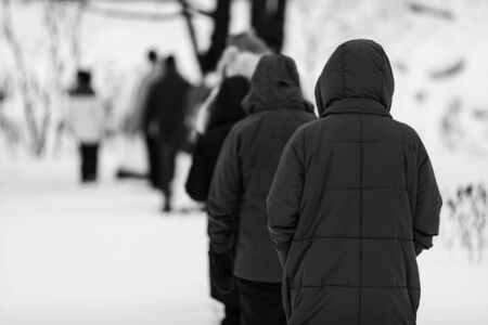 Out of focus, blurry background, a person goes on a snowy winter day. Bad weather