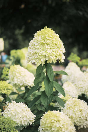 View of beautiful large white hydrangea paniculata blossoms close up