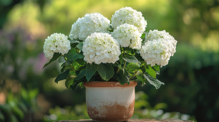 A stunning arrangement of white hydrangea flowers in a rustic pot, beautifully showcasing nature's elegance and tranquility in a serene garden setting.