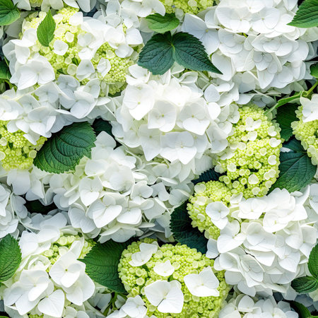 Close-Up of Lush Green and White Hydrangeas in Bloom with Dewy Fresh Leaves