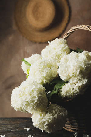 side view closeup of wicker bag with knitted handles full of white snowball flowers on dark black background in natural light copyspace on the right
