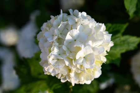 White hydrangeas bloom vibrantly under warm sunlight in a garden, creating a peaceful and tranquil atmosphere on a spring afternoon. The lush greenery enhances this tranquil scene.