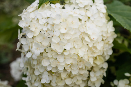 Delicate large white hydrangea flowers blooming in the garden in summer create a delicate and elegant natural picture, ideal for landscape design