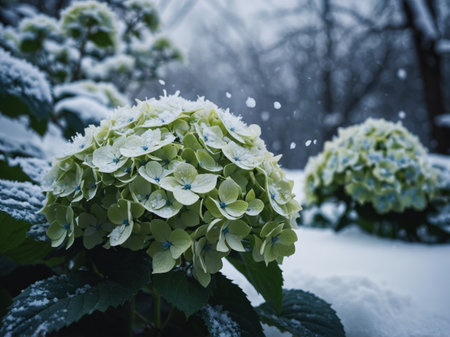 AI Generated. Hydrangea blossoms under a snowy whirl, each petal exhibiting the wavy and calming beauty of winter